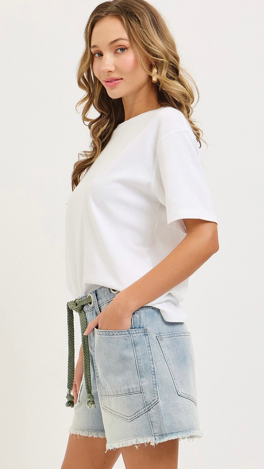 Details: Grommet Waist with Rope Belt / Zip Fly / Front Patch Pockets / Frayed Hem / Sage Green Rope Belt