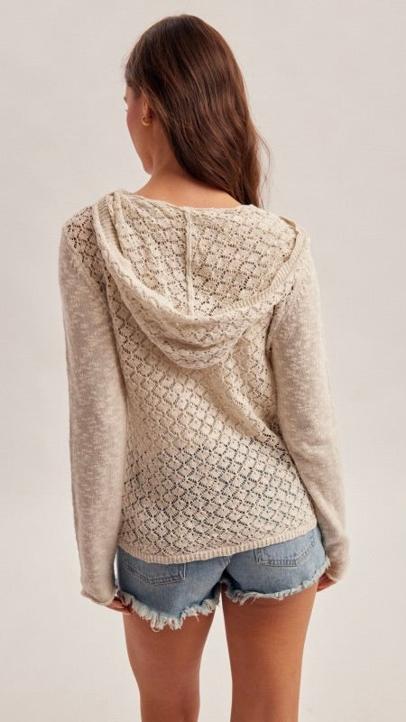 Details: 3 Button Front / Crochet Back, Hood + Roo Pocket / Spring Wt Sweater Knit