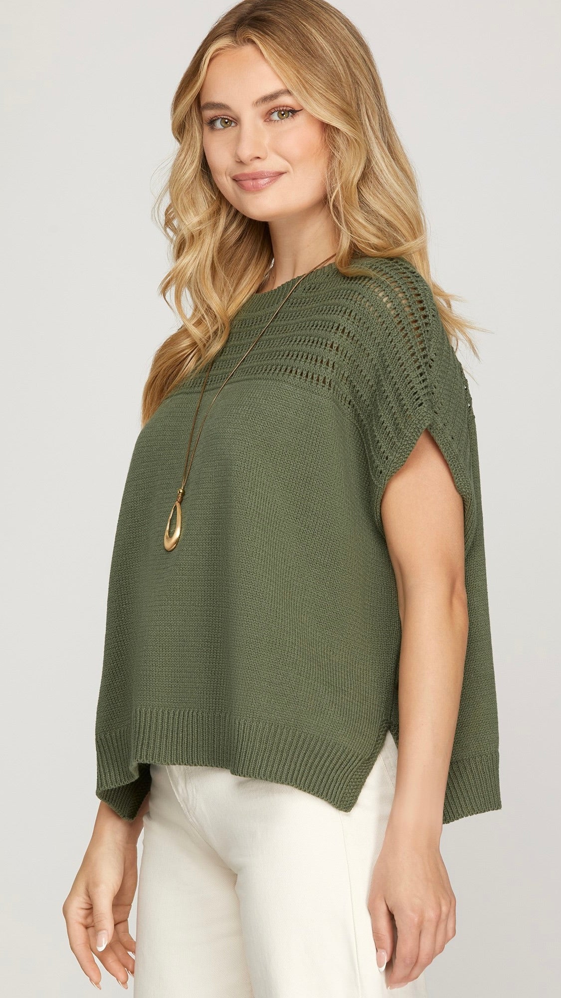 Details:  Round Neck / Pointelle Yoke / Side Split Hem / Dolman Sleeve