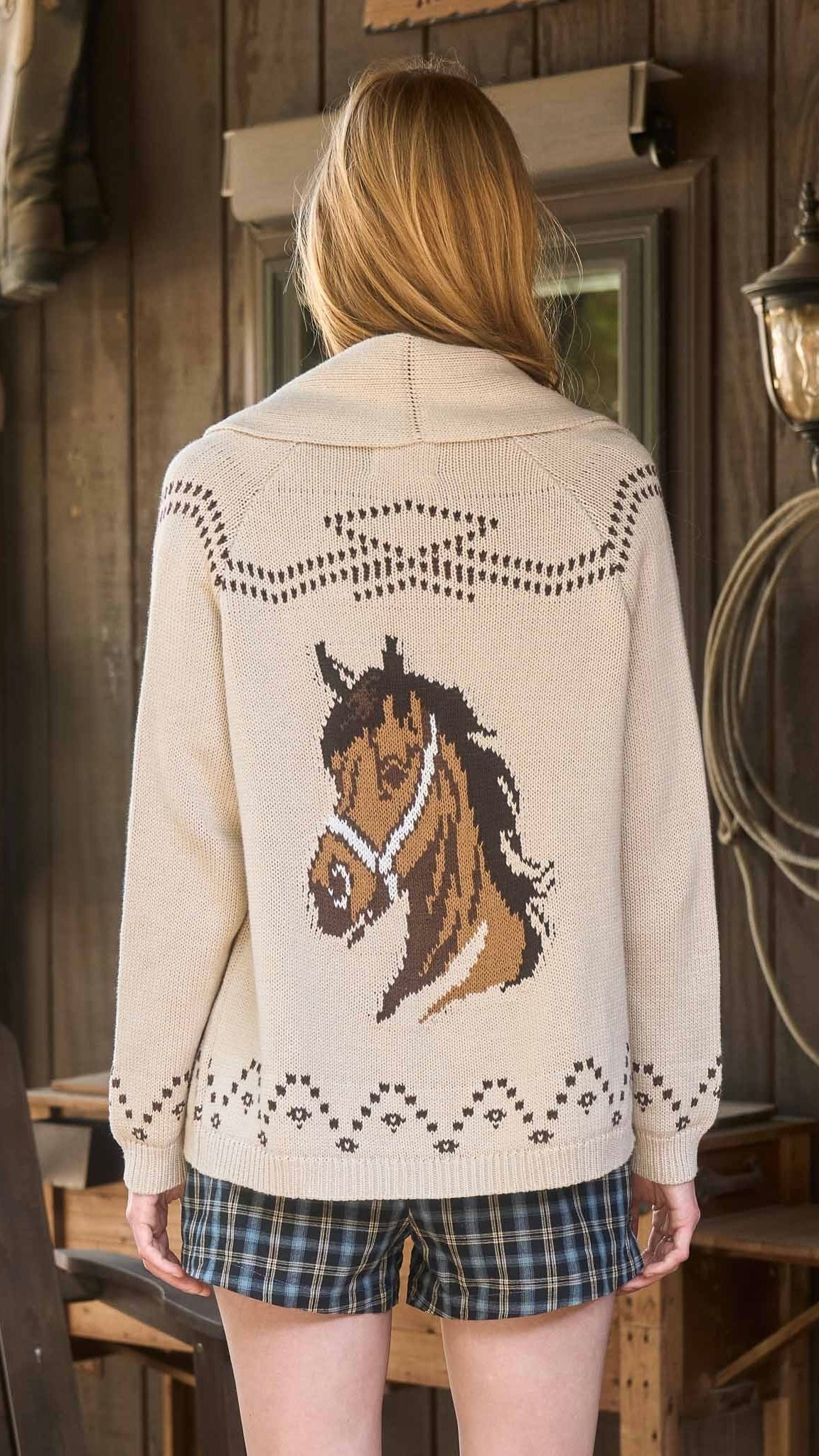 Details:  Shawl Collar / Raglan Sleeve / Horse Pattern Back / Western Theme / Open Front