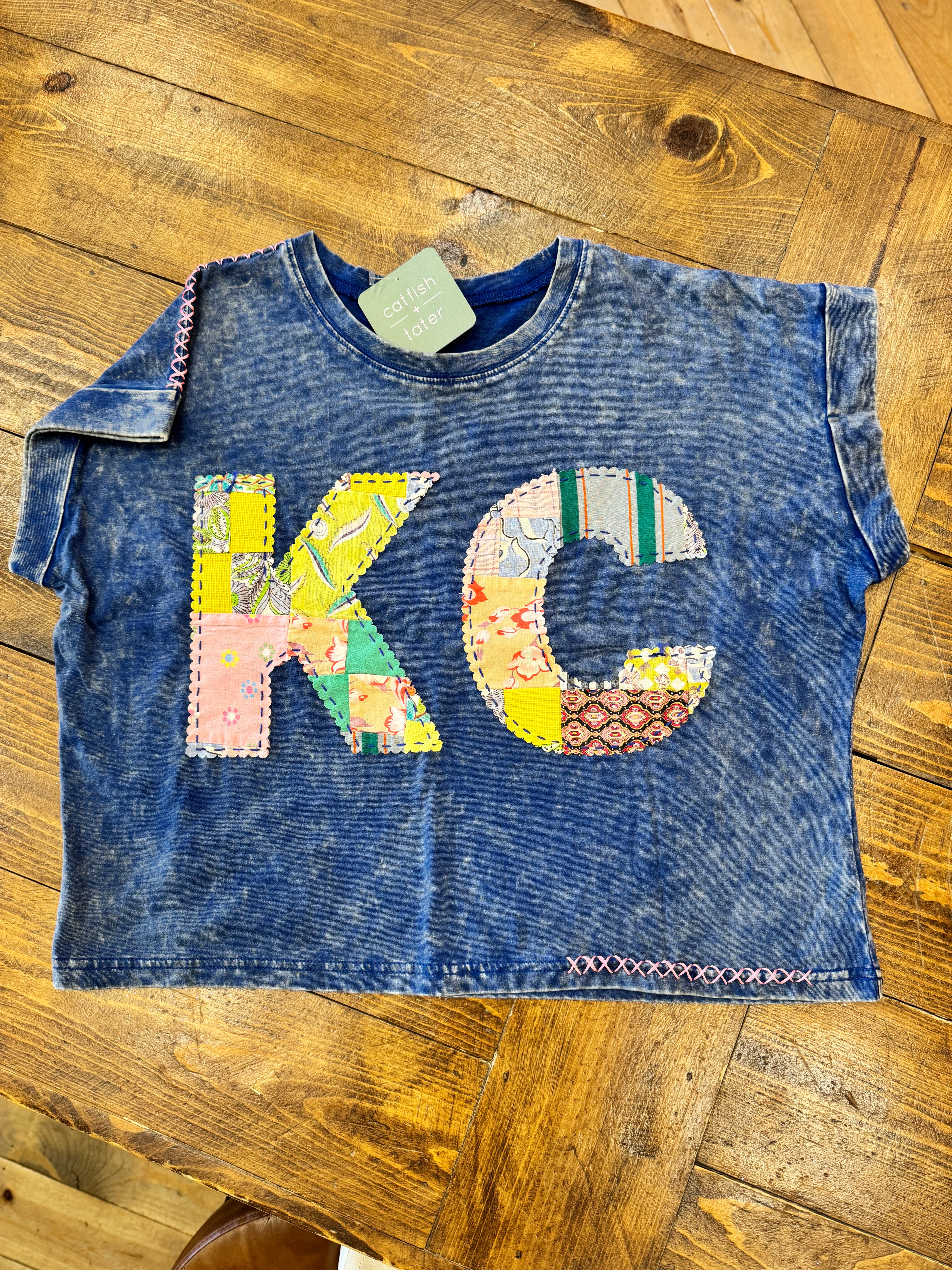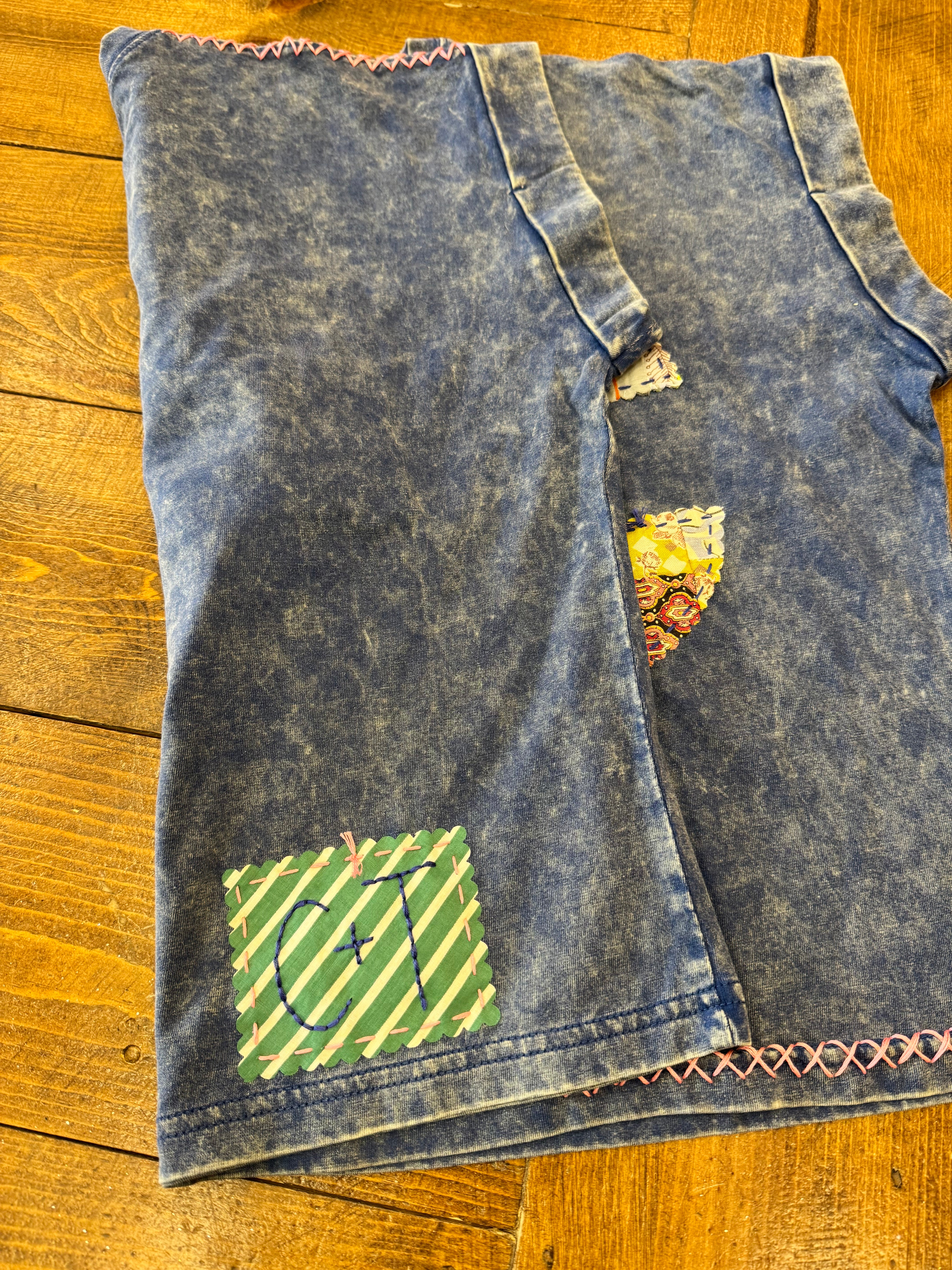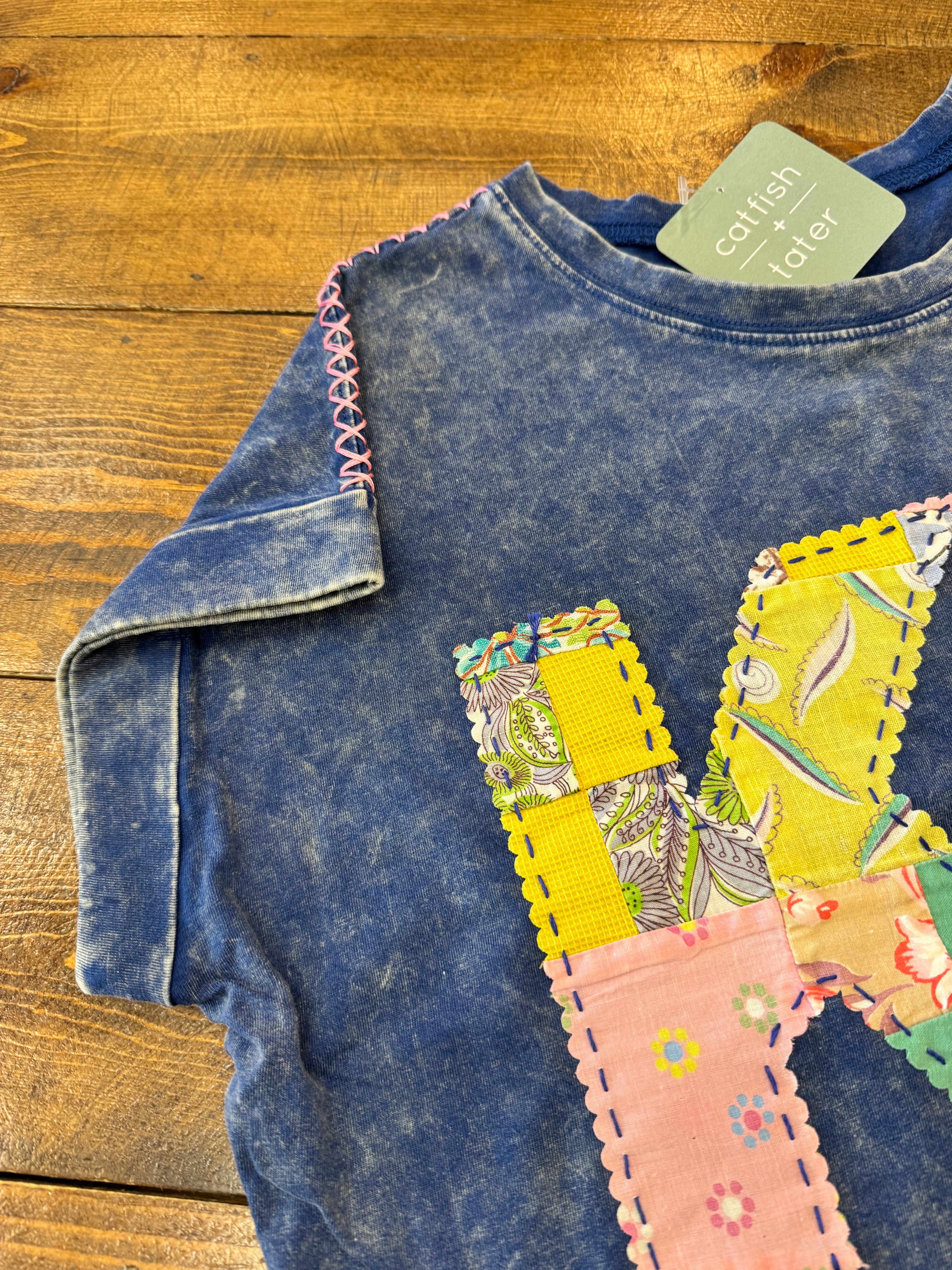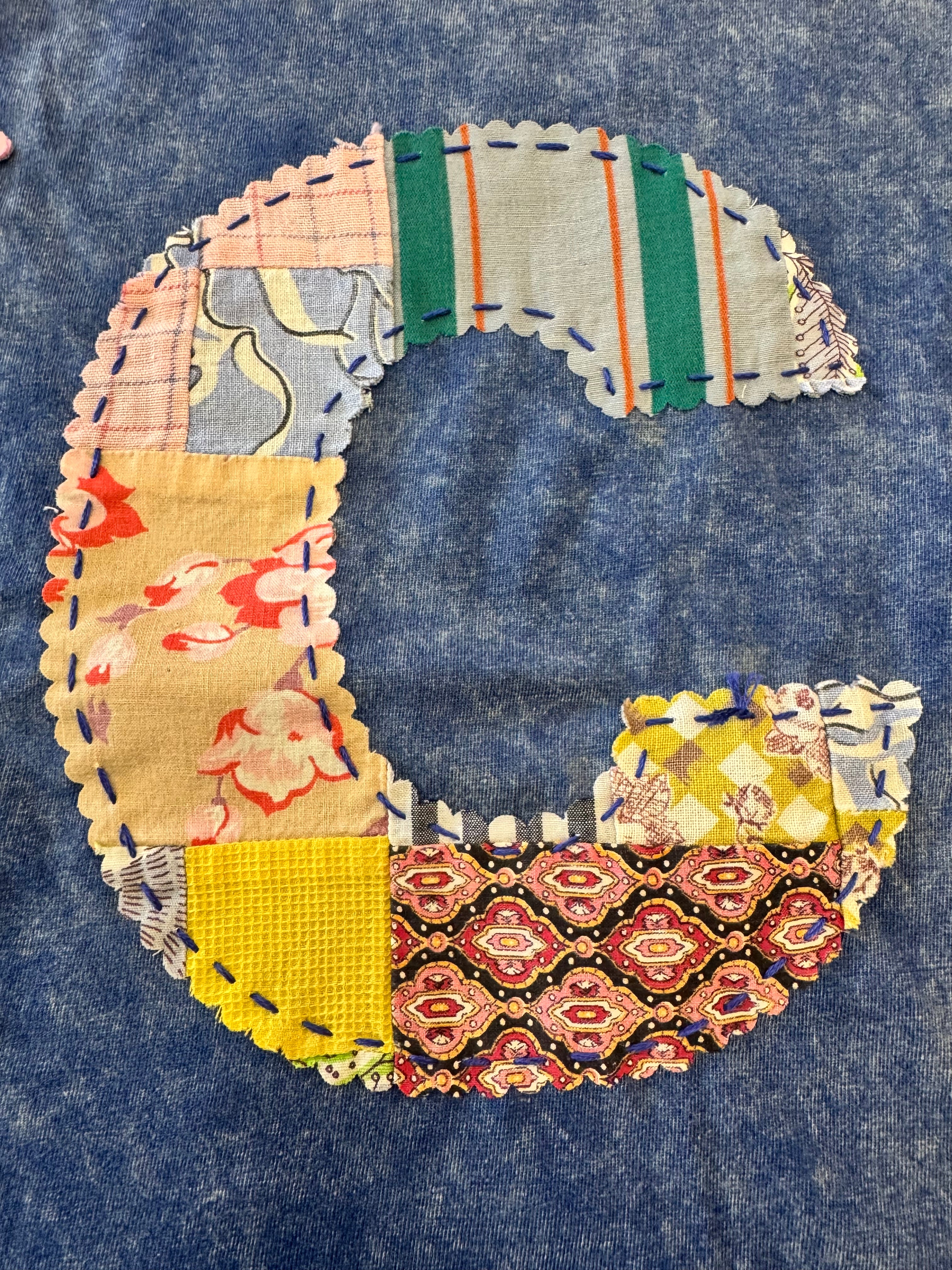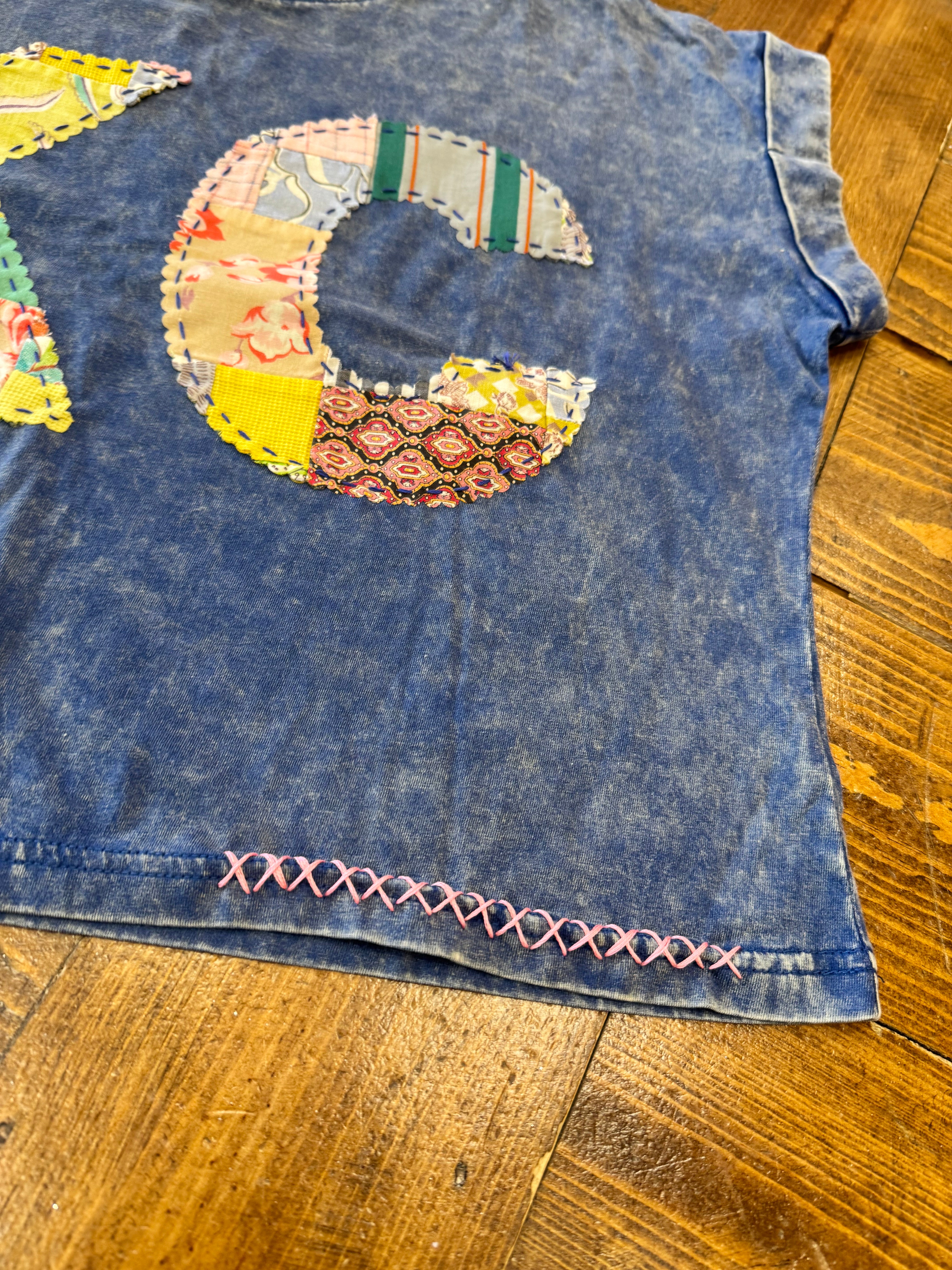 Details: Hand-Stitched from pre-washed Vintage Quilts, so each one is unique. Scalloped Edge lettering is fused then hand-stitched to shirt. There is also hand x-stitching at bottom hem + one shoulder. Back patch with hand-stitch C+T branding.