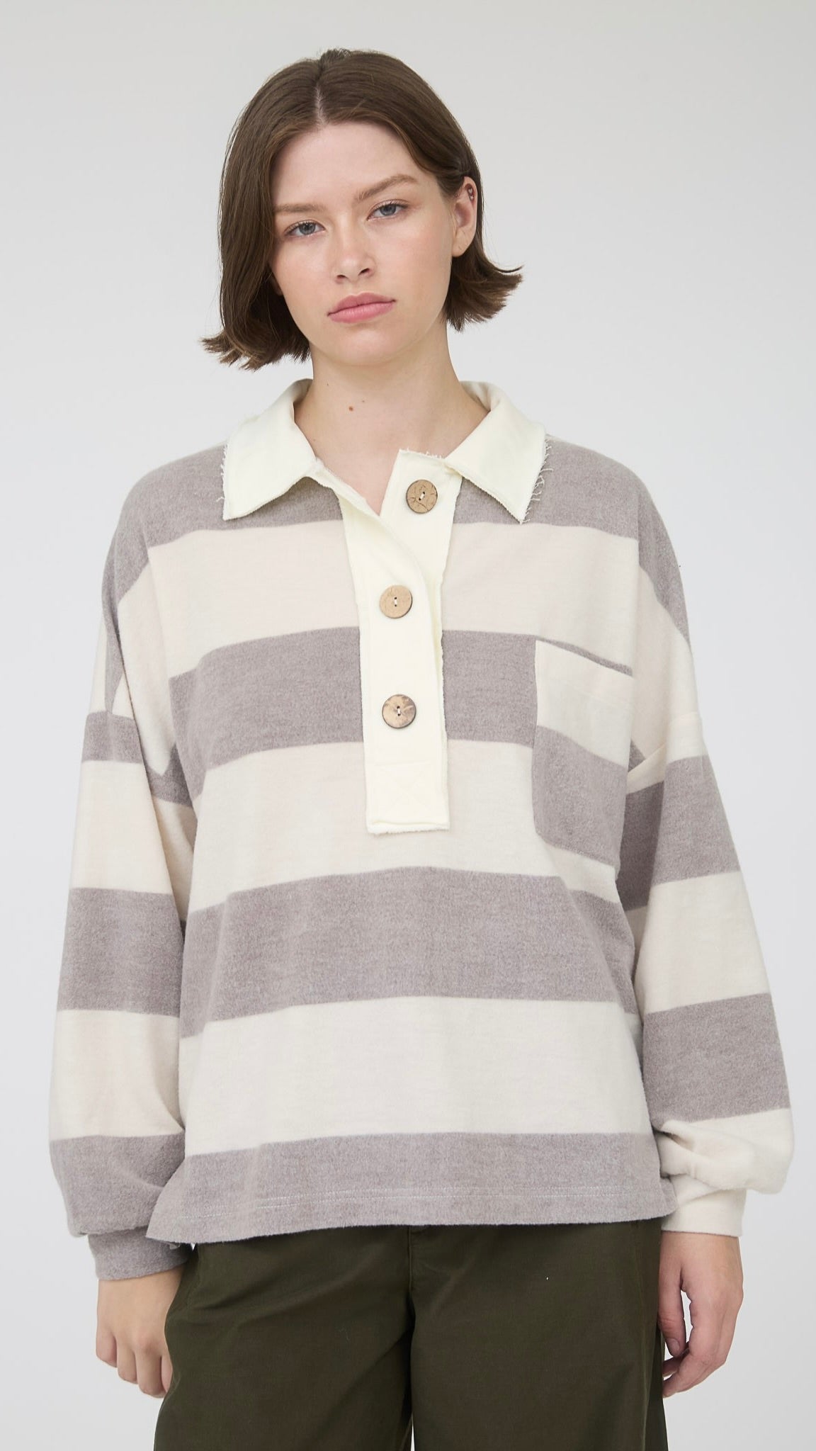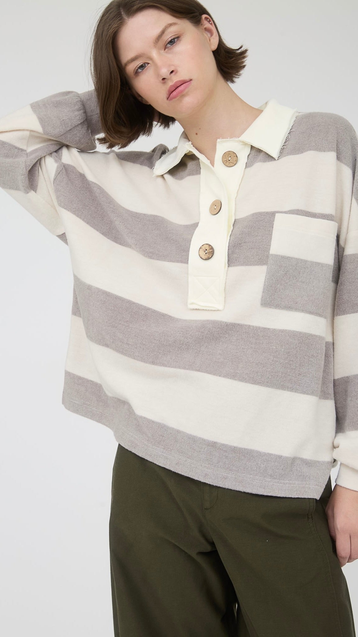 Details:  Henley Button Front / Collar / Drop Shoulder / Chest Pocket