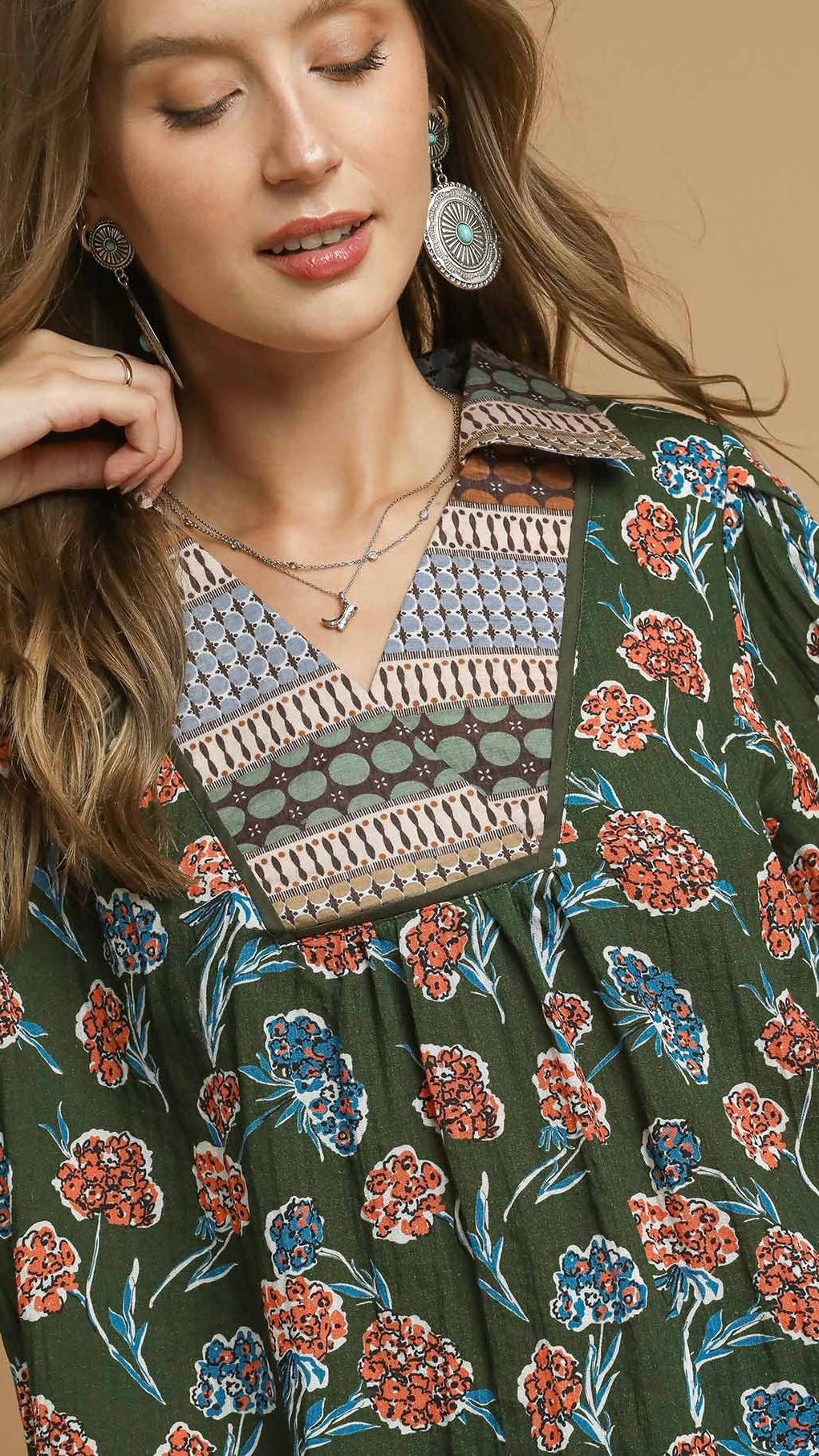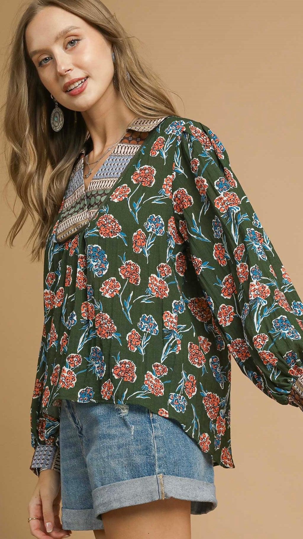 Details: Contrast Front Bib / Foldover Collar / Bubble Long Sleeve / Banded Cuff / Hi-Lo Hem