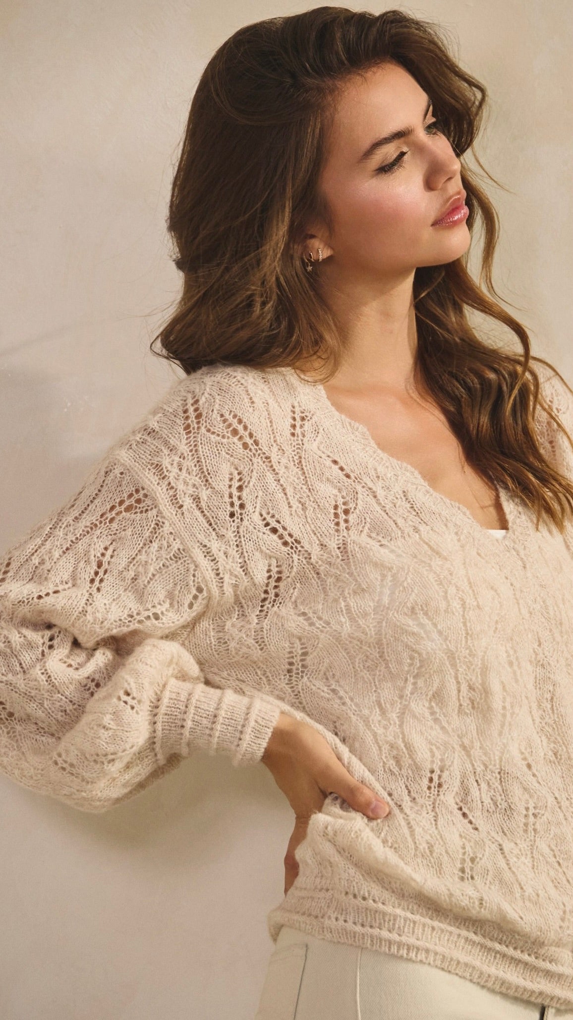 Details: Bubble Sleeve / Banded Cuffs / V-Neck / Pointelle Knit