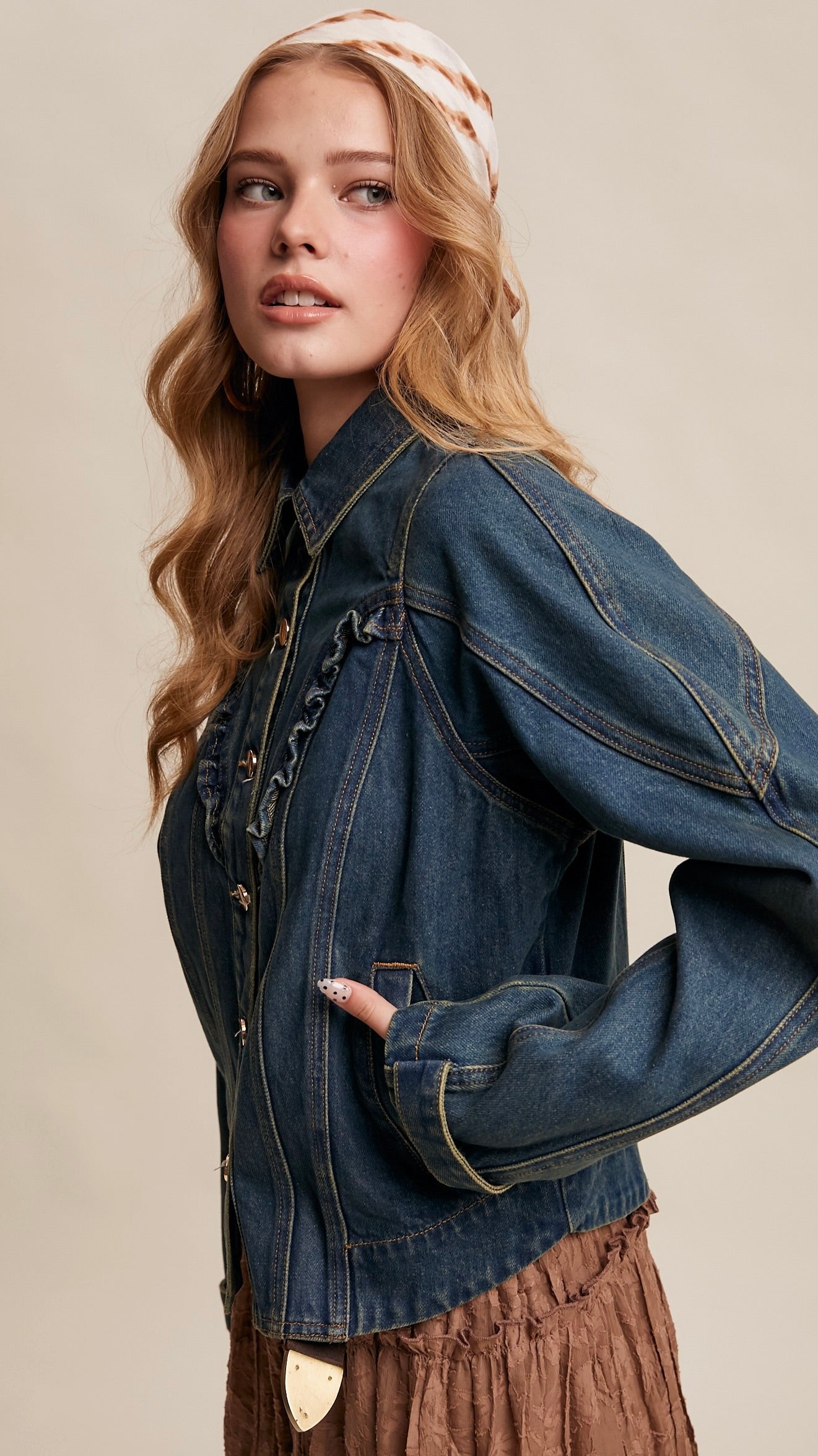 Details:  Ruffle Trim / Western Accents / Welt Pockets / Contrast Stitching / Button Front
