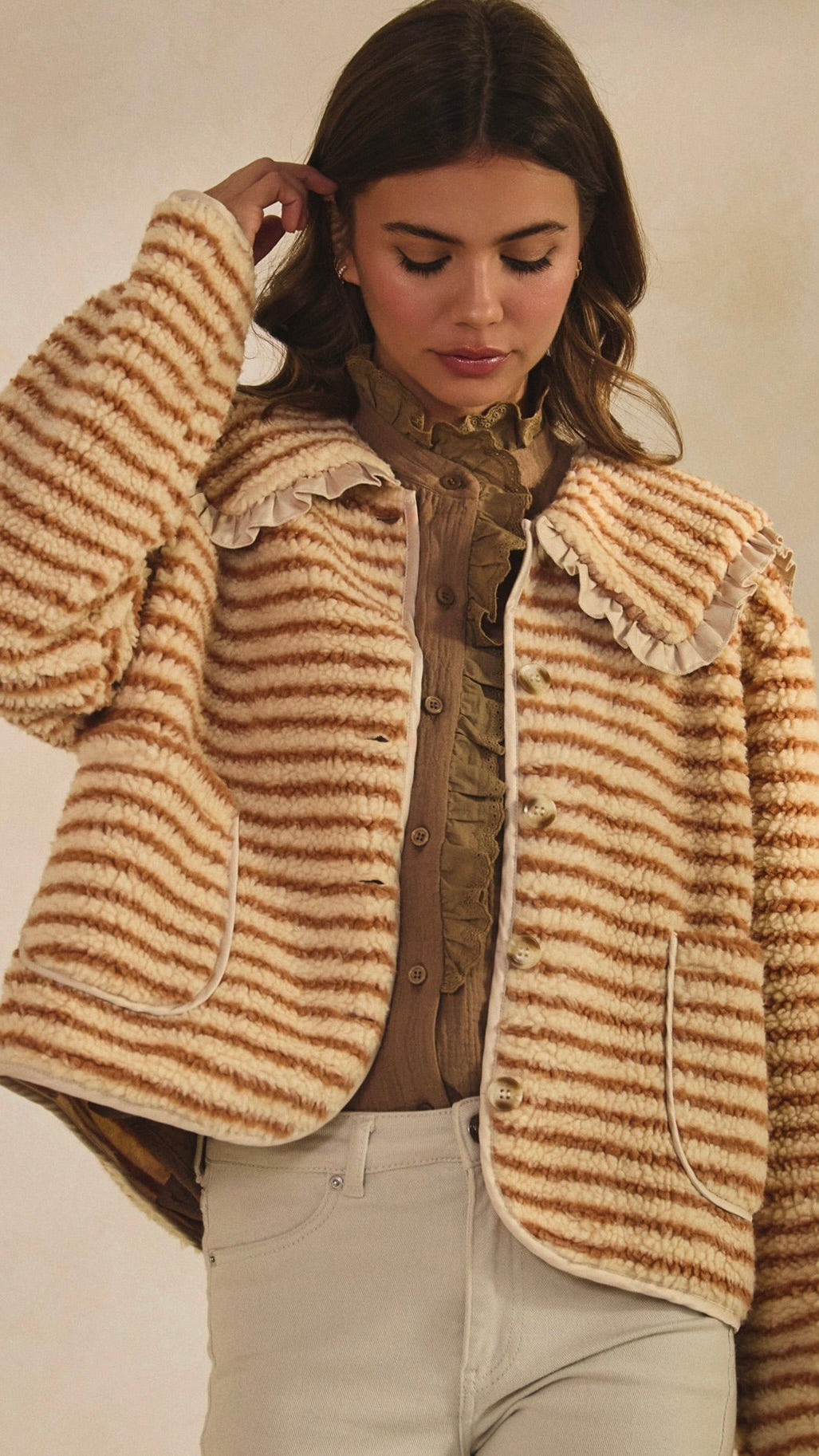 Details: Striped Sherpa Fleece / Front Patch Pockets / Button Front / Sailor Style Collar / Satin Trim Accents
