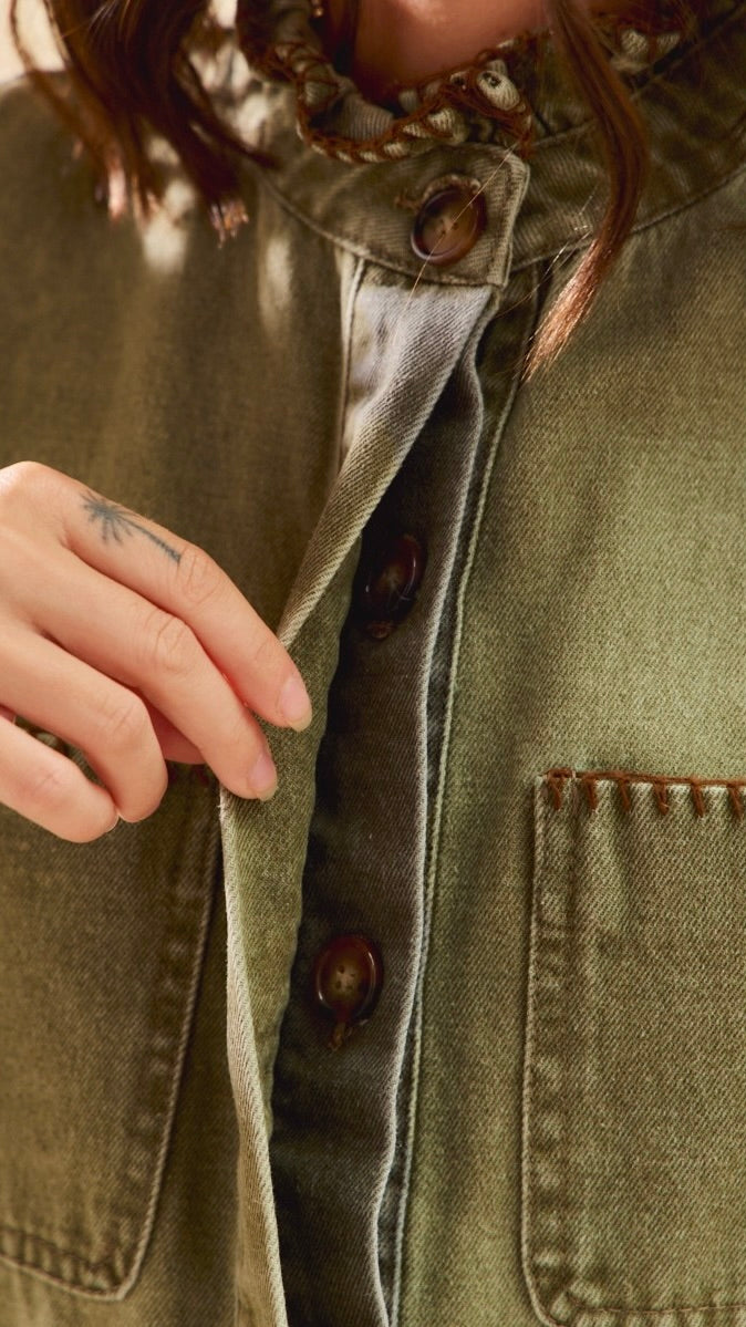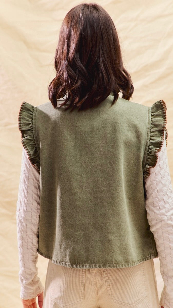 Details: Hidden Button Front / Double Front Pockets / Blanket Stitch Trim / Ruffle Shoulder +Neck