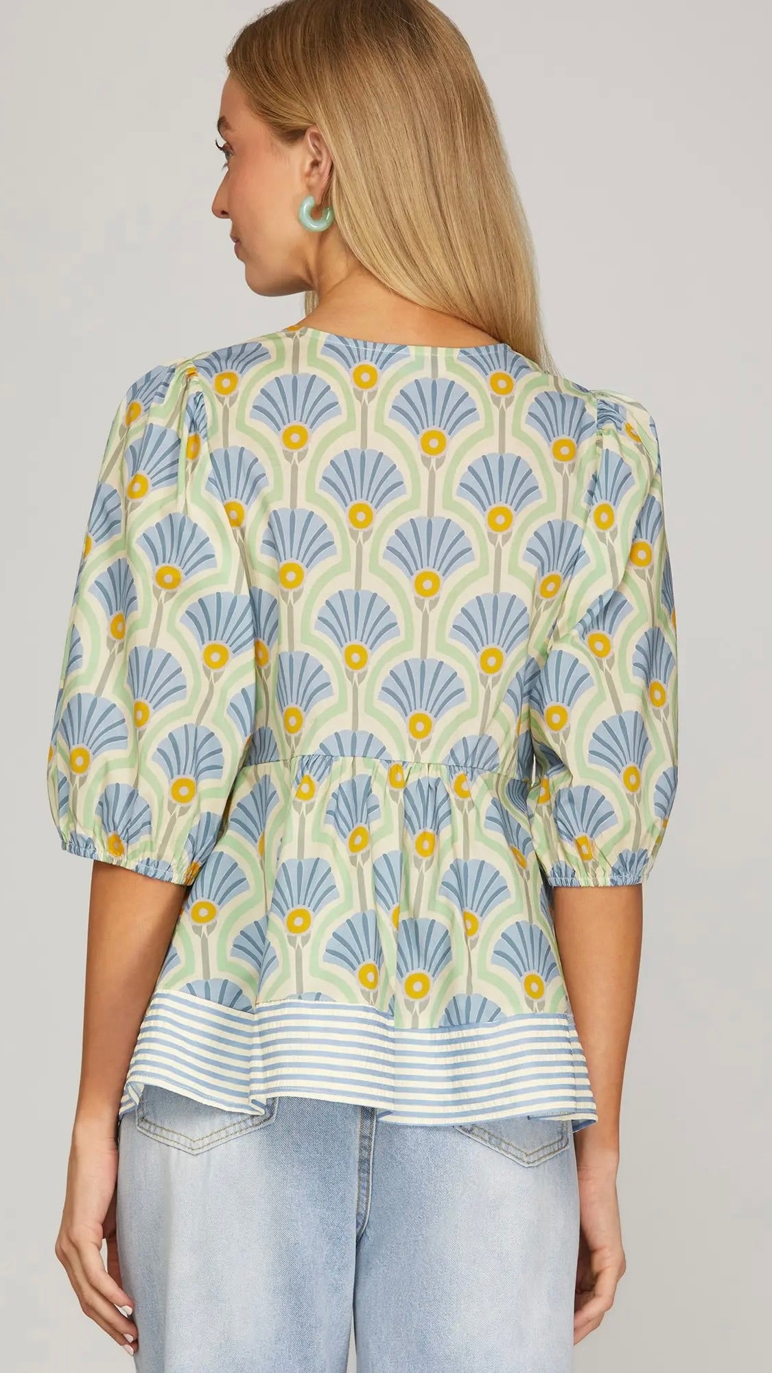 Details: Contrast Stripe Trim / Split Neck / Collarless / Peplum / Bubble Half Sleeve