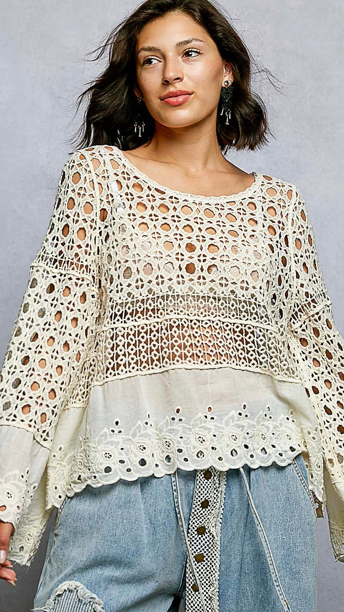 Details: Wide Neck / Crochet Bodice / Eyelet Long Sleeve + Peplum Hem