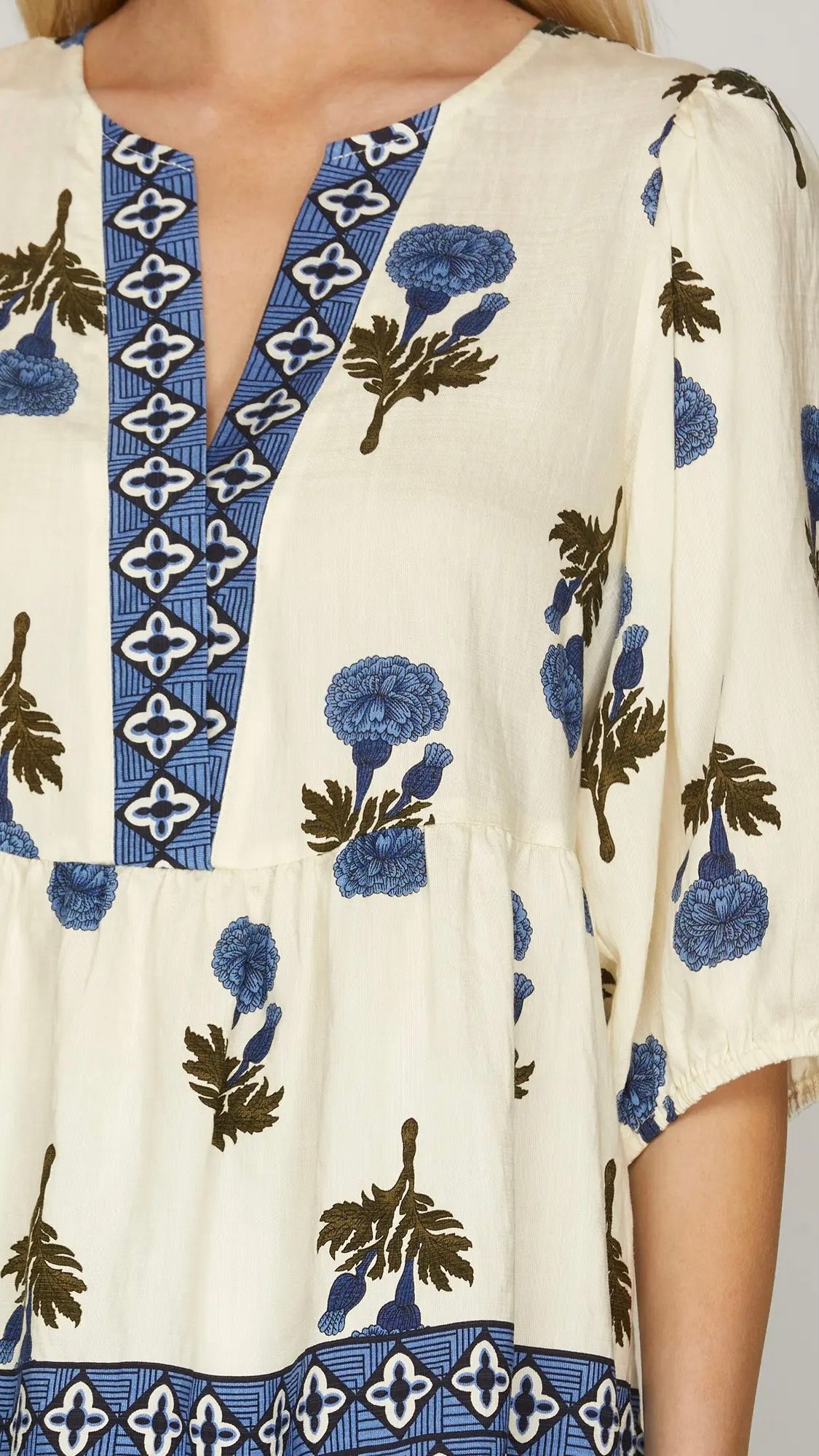 Details: Contrast Trim / Split Neck / Half Sleeve / Peplum Hem