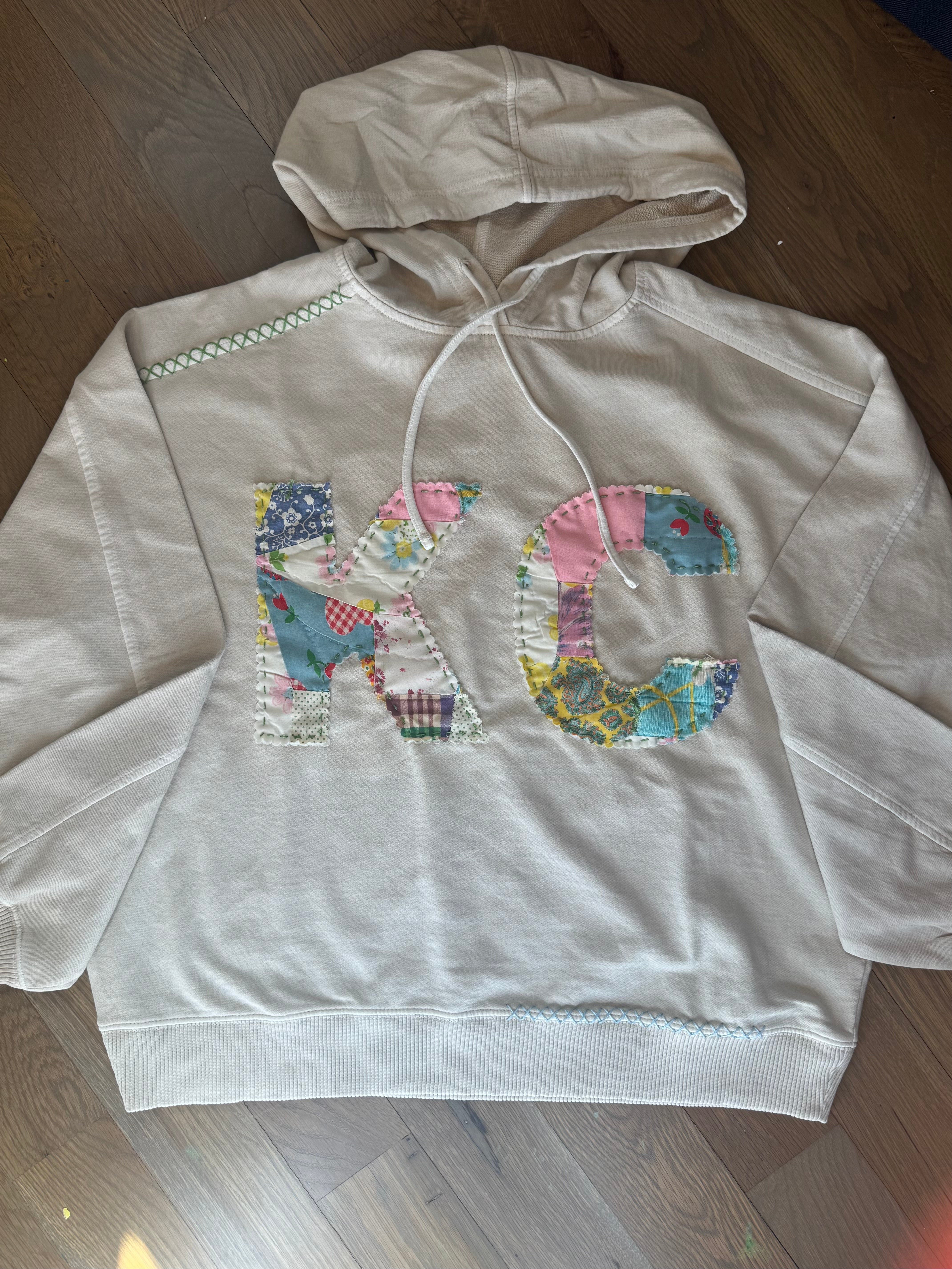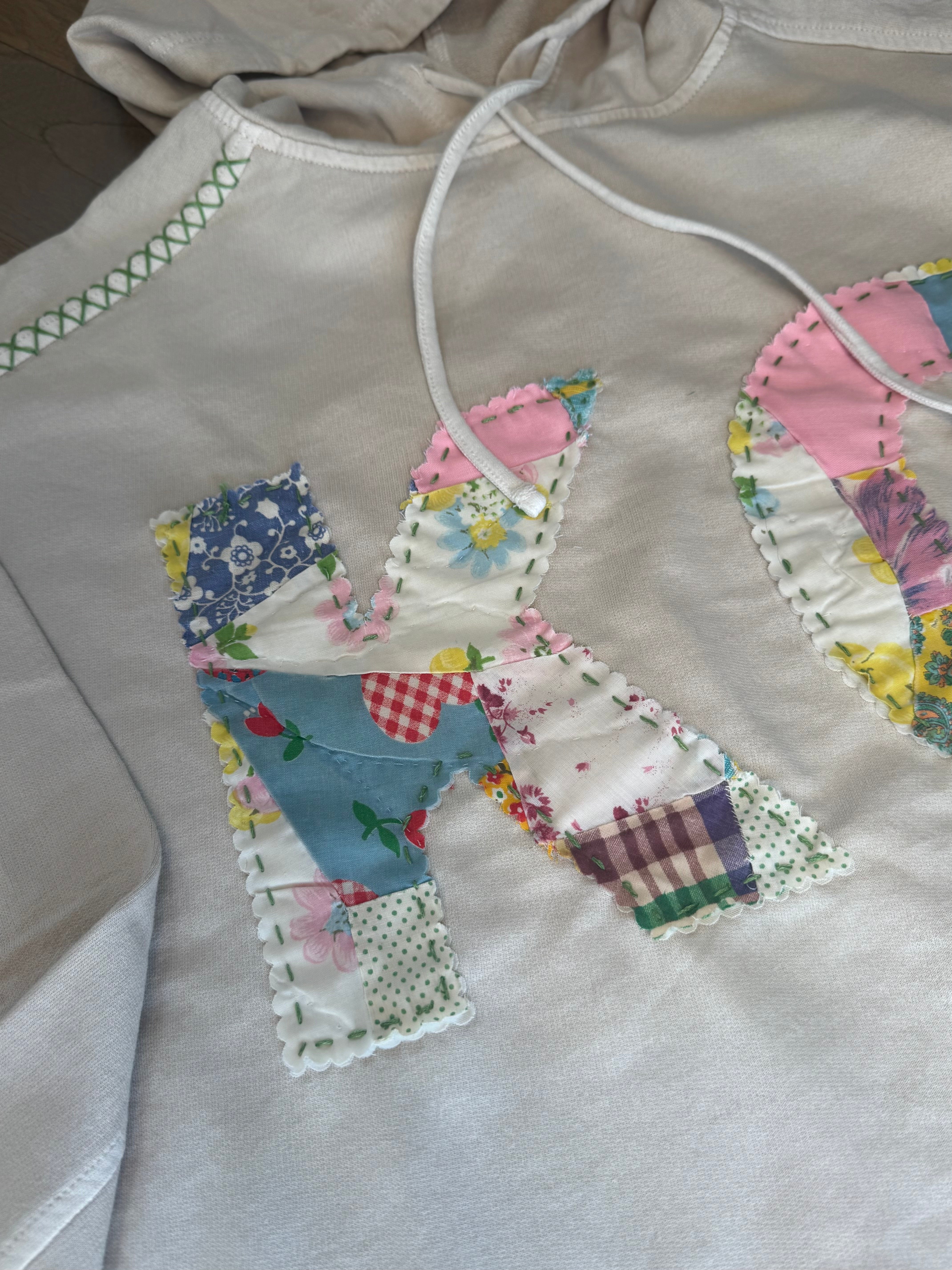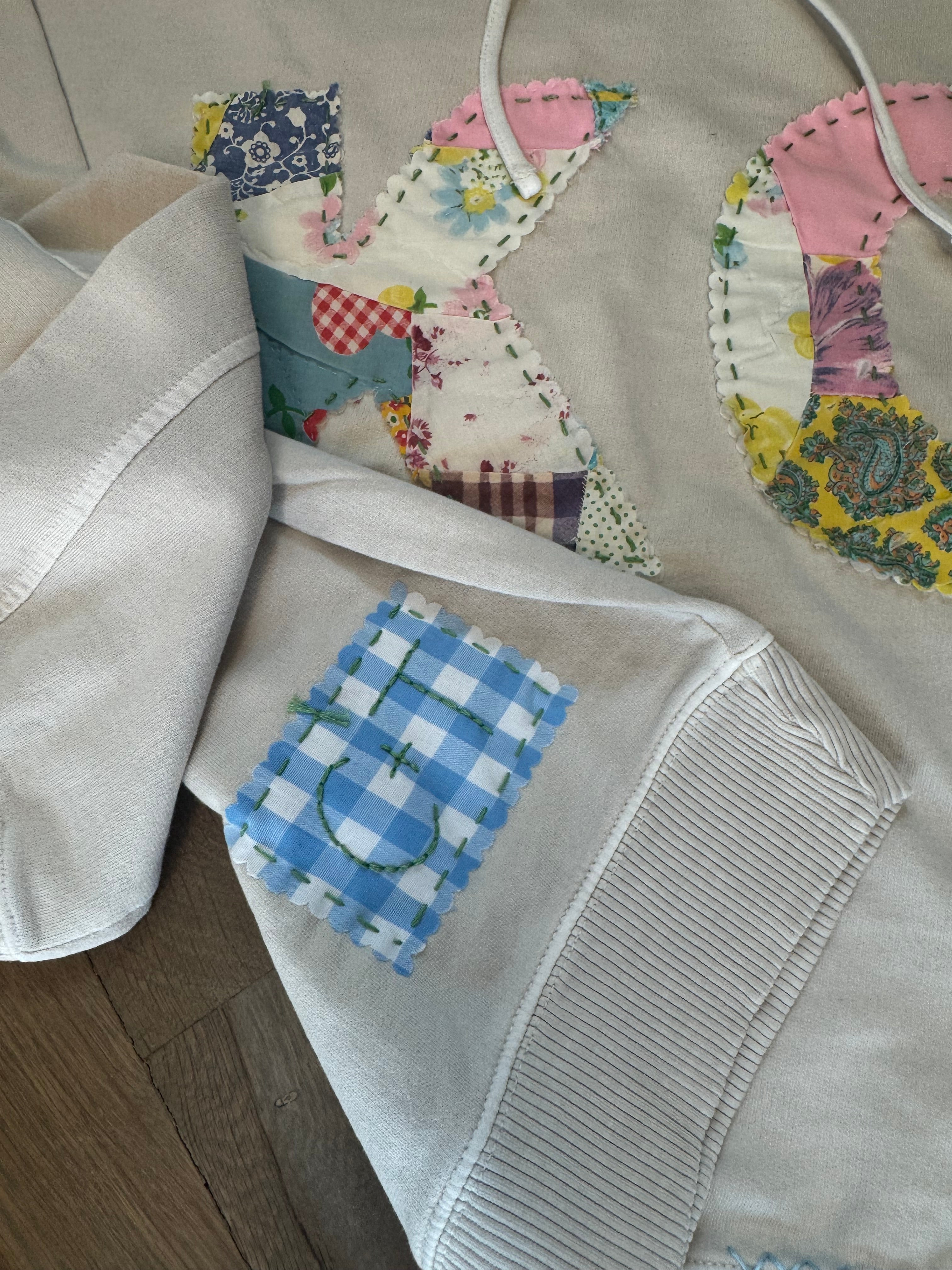 Details:  Hand-Stitched from pre-washed Vintage Quilts, so each one is unique.  Scalloped Edge lettering is fused then hand-stitched to sweatshirt.  There is also hand x-stitching at bottom hem + one shoulder.  Back patch with hand-stitch C+T branding.