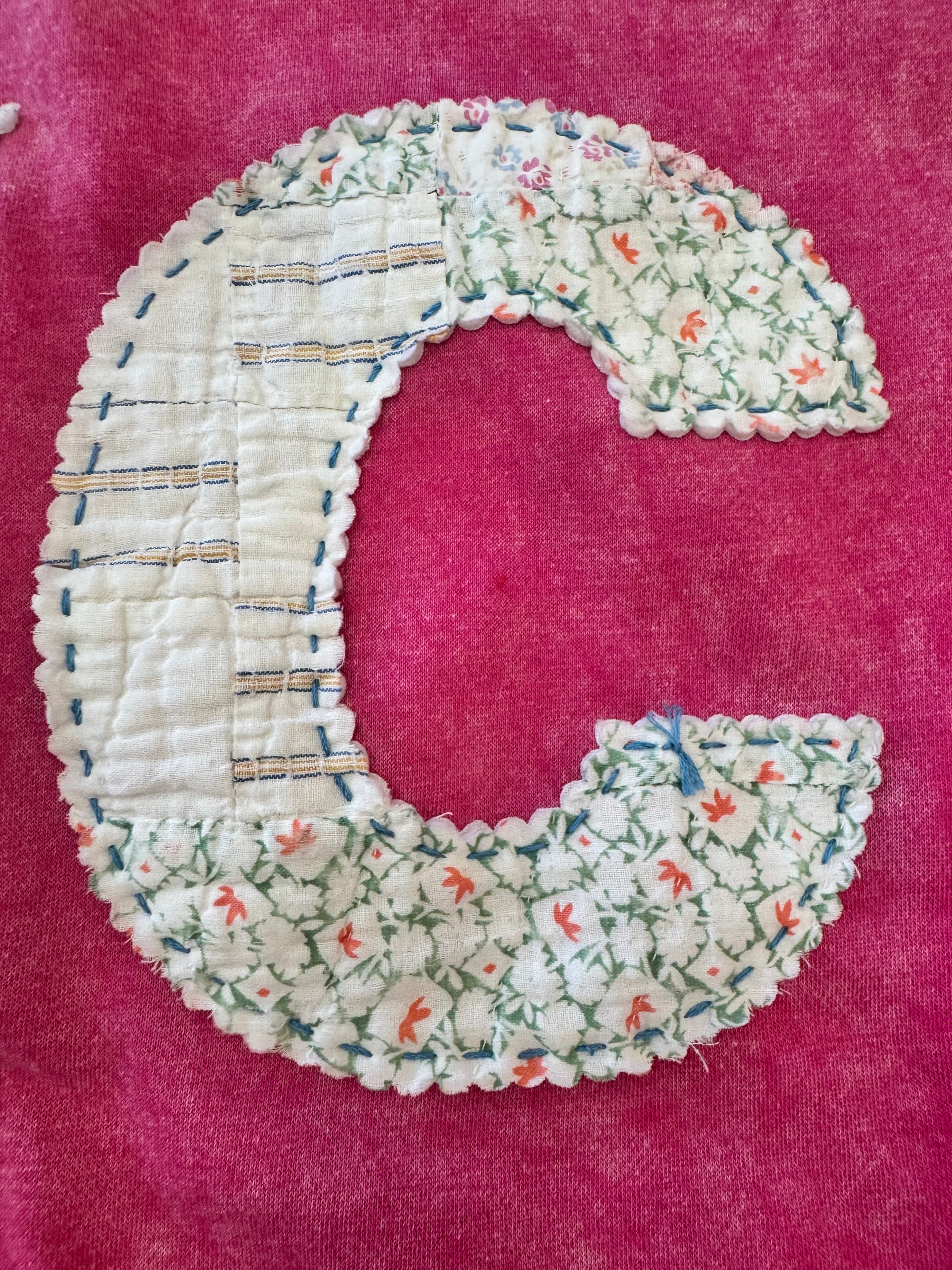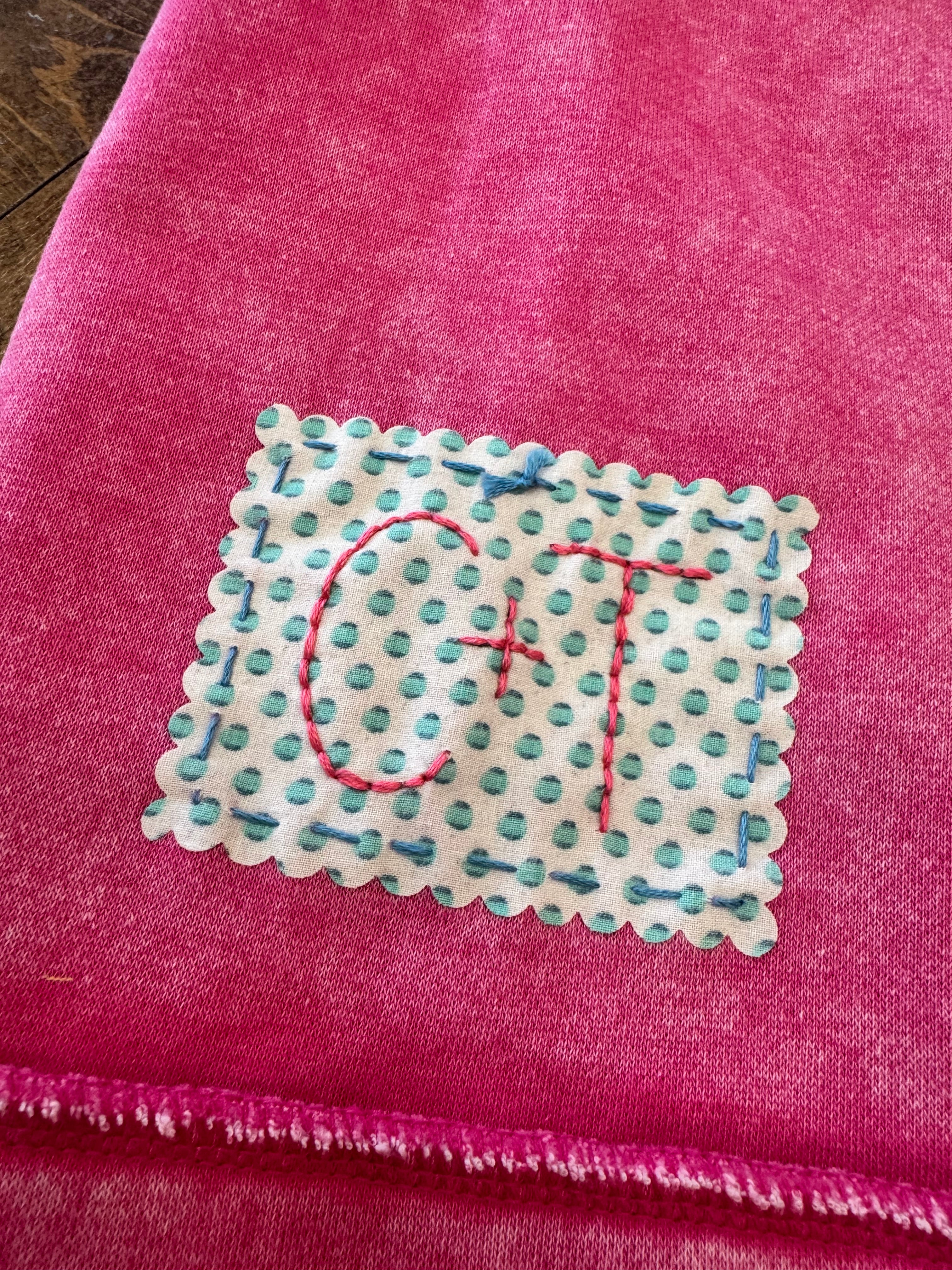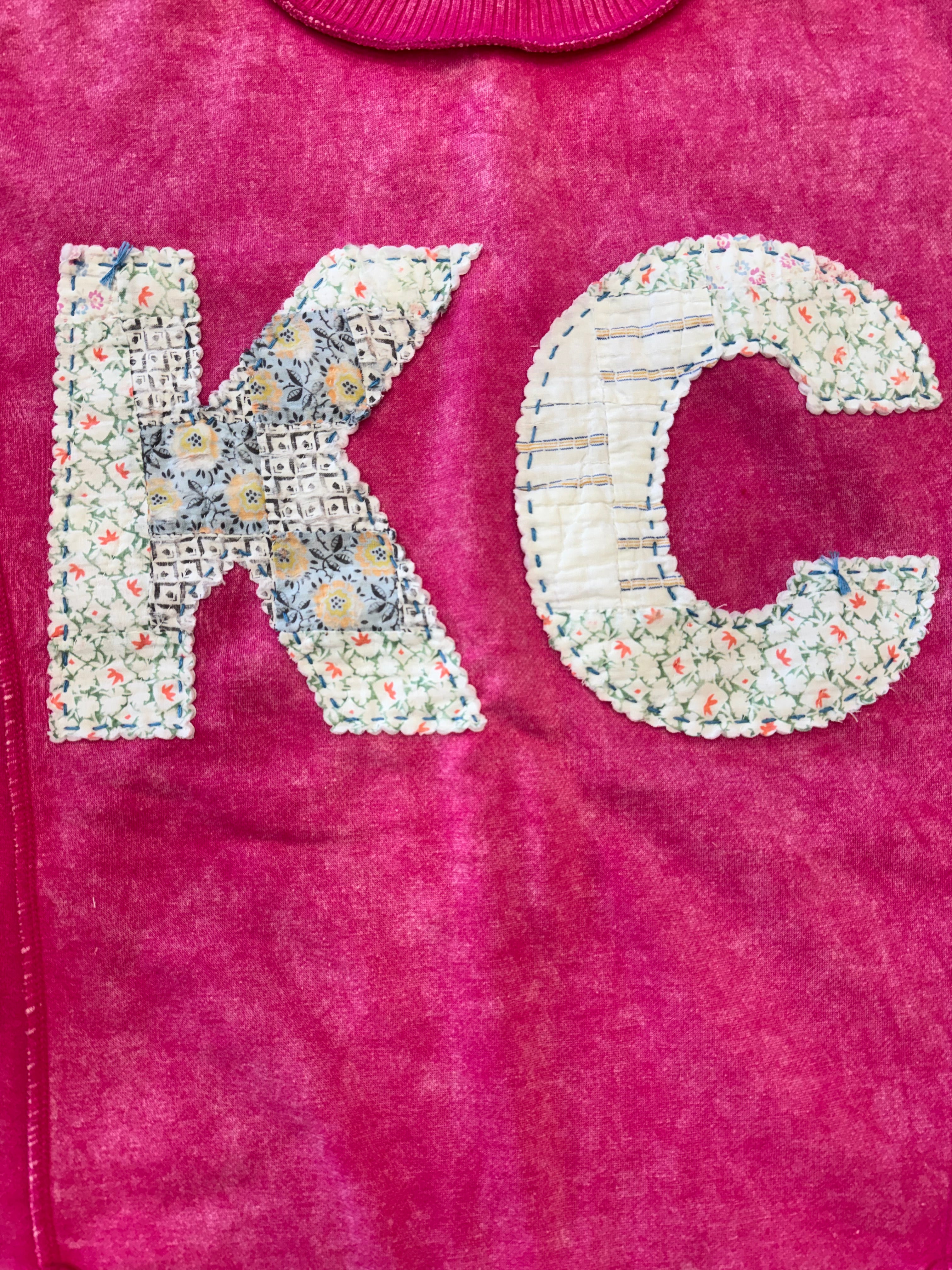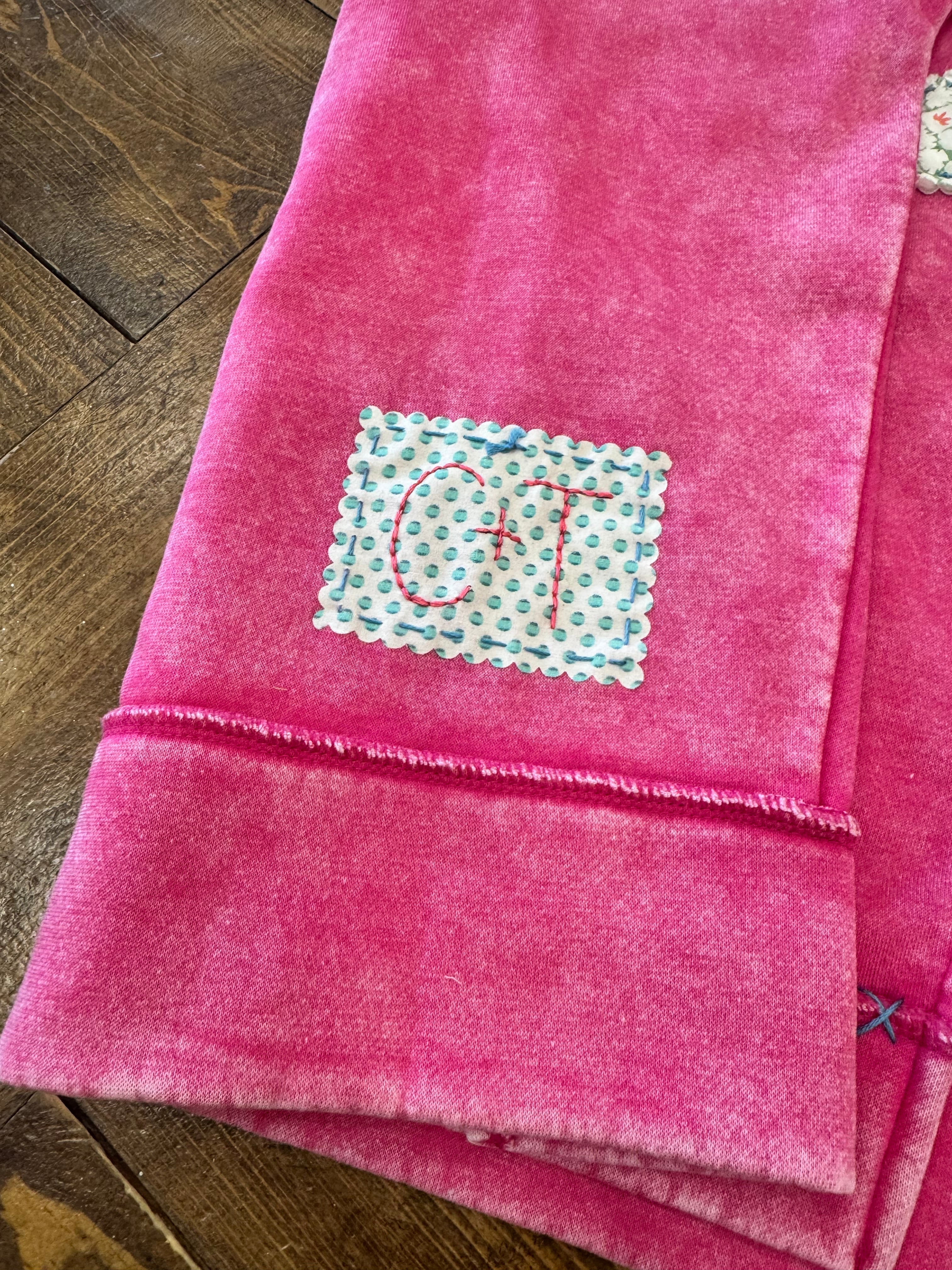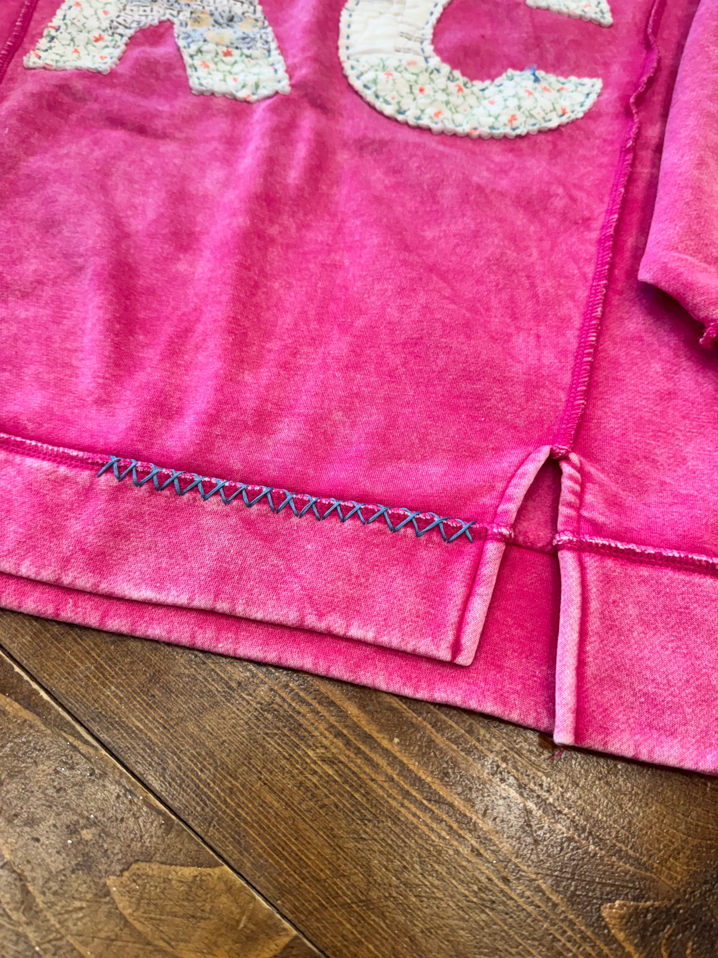 Details: Hand-Stitched from pre-washed Vintage Quilts, so each one is unique. Scalloped Edge lettering is fused then hand-stitched to sweatshirt. There is also hand x-stitching at bottom hem + one shoulder. Back patch with hand-stitch C+T branding.
