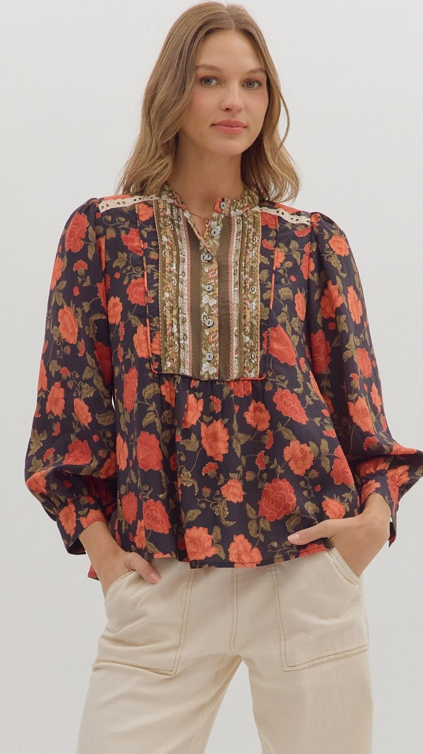 Details:  Pintuck Front Bib / Eyelet Ribbon Trim / Button Cuff Long Sleeve / Contrast Fabric
