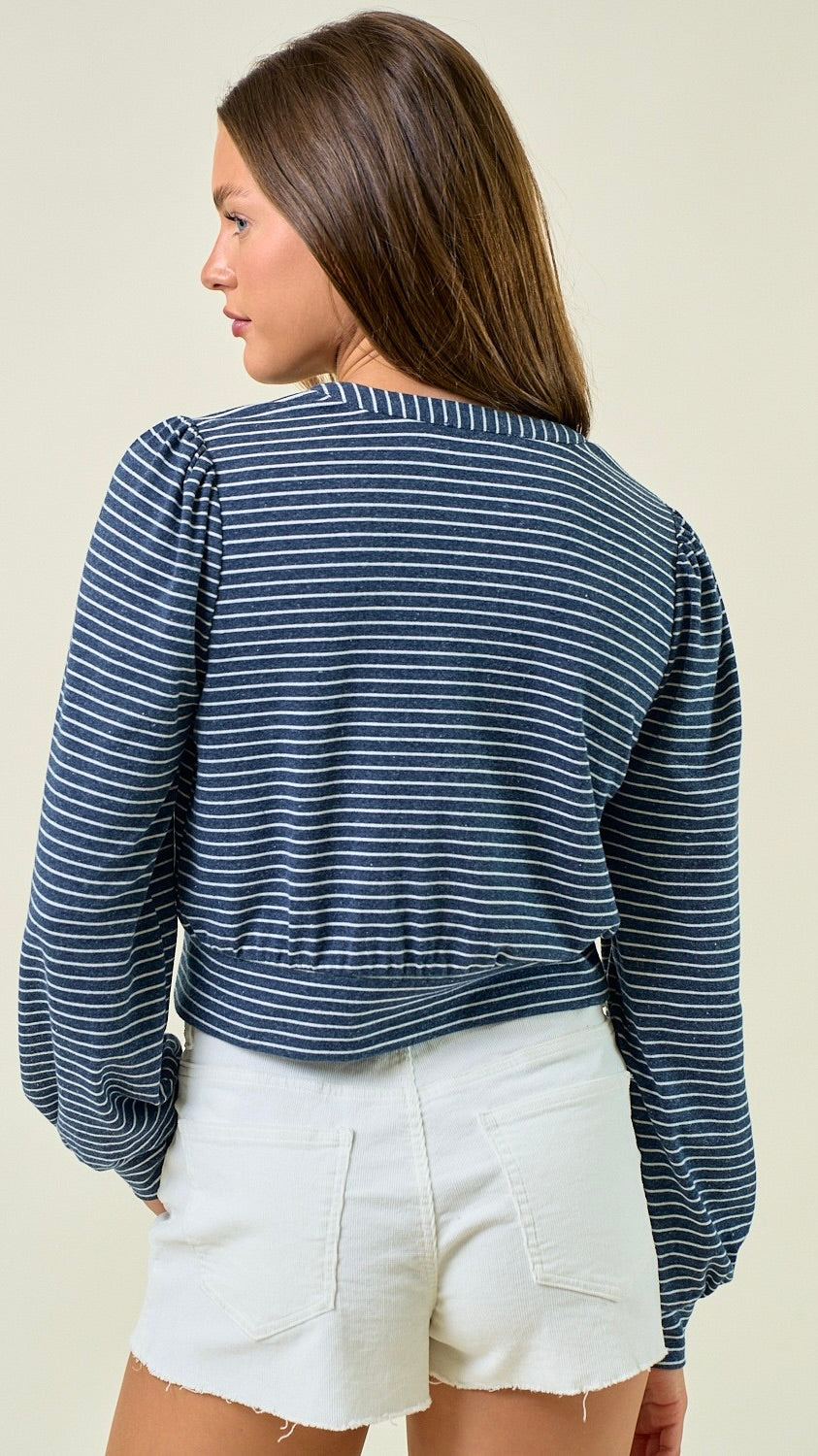 Details: Button Front / Banded Hem + Cuffs / Round Neck / Bubble Sleeve