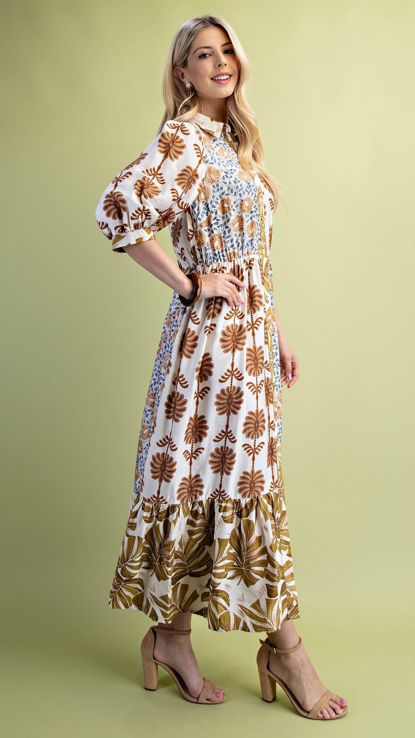 Details: Button Front / Covered Buttons / Half Sleeve / Ruffle Hem / Collar / Sideseam Pockets / Unlined
