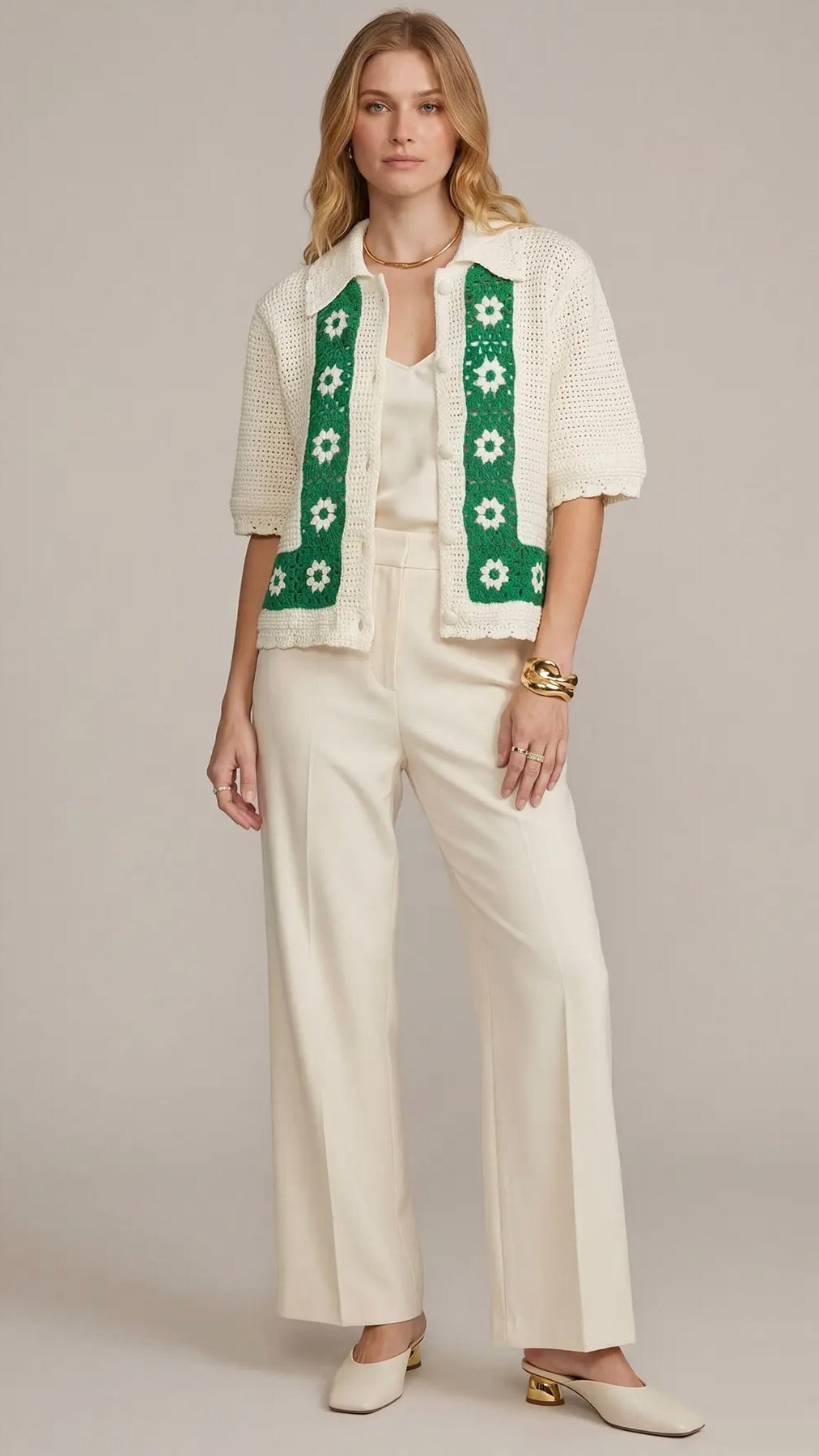 Elevate your casual wardrobe with this charming crochet border half sleeve sweater. Crafted from a soft cotton and acrylic blend with gentle stretch, it offers comfort and flexibility for everyday wear. The relaxed fit drapes beautifully, while delicate crochet trim along the borders adds a touch of handmade elegance. Button front closure and classic collar complete the look—perfect for layering or wearing solo during cooler months.