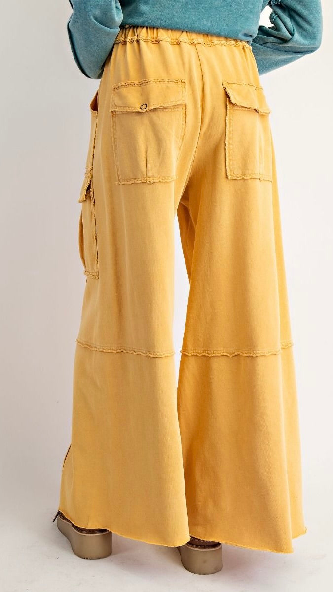 Details:  Elastic + Drawstring Waist / Front + Back Snap Cargo Pockets / Raw Seams / Raw Hem / Slash Front Pockets